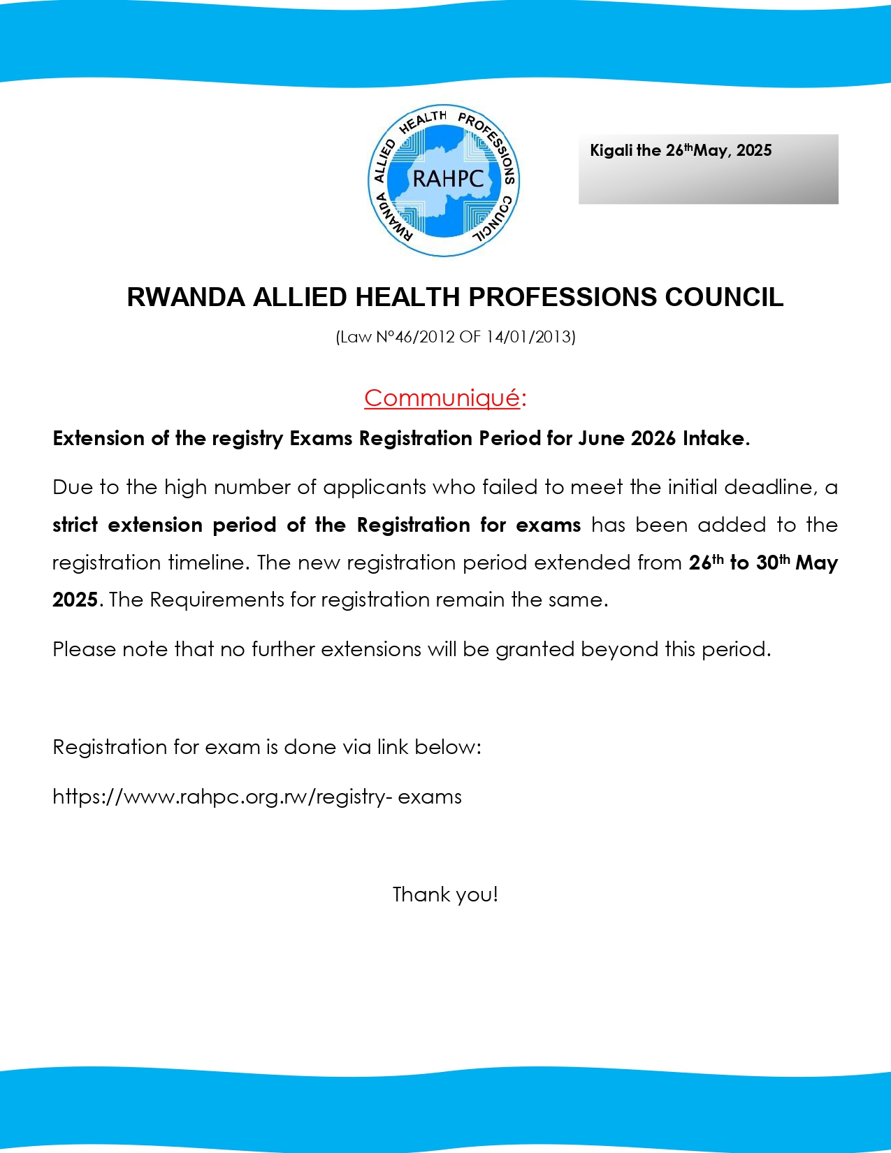 Extension of the registry Exams Registration Period for June 2026 Intake. Due to the high number of applicants who failed to meet the initial deadline, a strict extension period for Registration for exams has been added to the registration timeline. The new registration period extended from 26th to 30th May 2025. The Requirements for registration remain the same. Please note that no further extensions will be granted beyond this period. Registration for exam is done via the link below: https://www.rahpc.org.rw/registry- exams